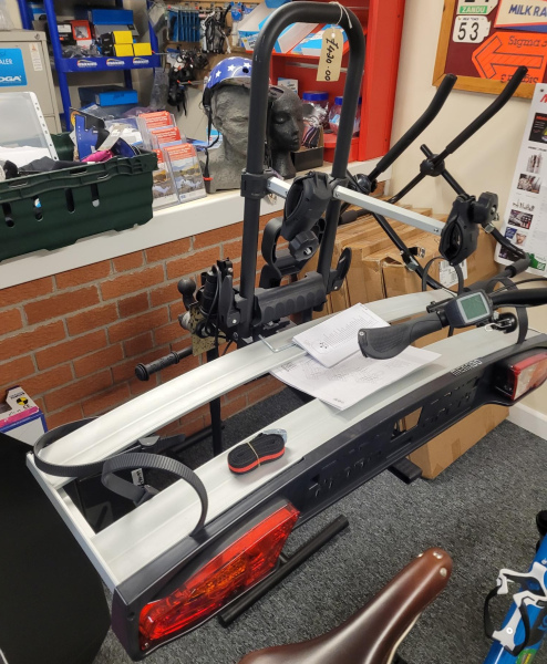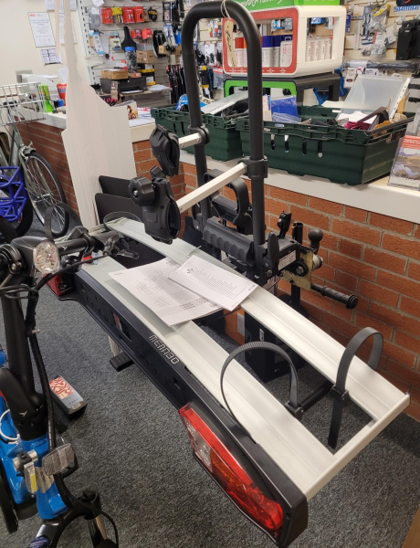 Towbar-mounted bike carrier with steel and aluminum structure. Compatible with E-bikes and Fat bikes, it offers a maximum capacity of 2 bikes and 60kg total load. Equipped with a practical tilting system for boot access and standard anti-theft lock.